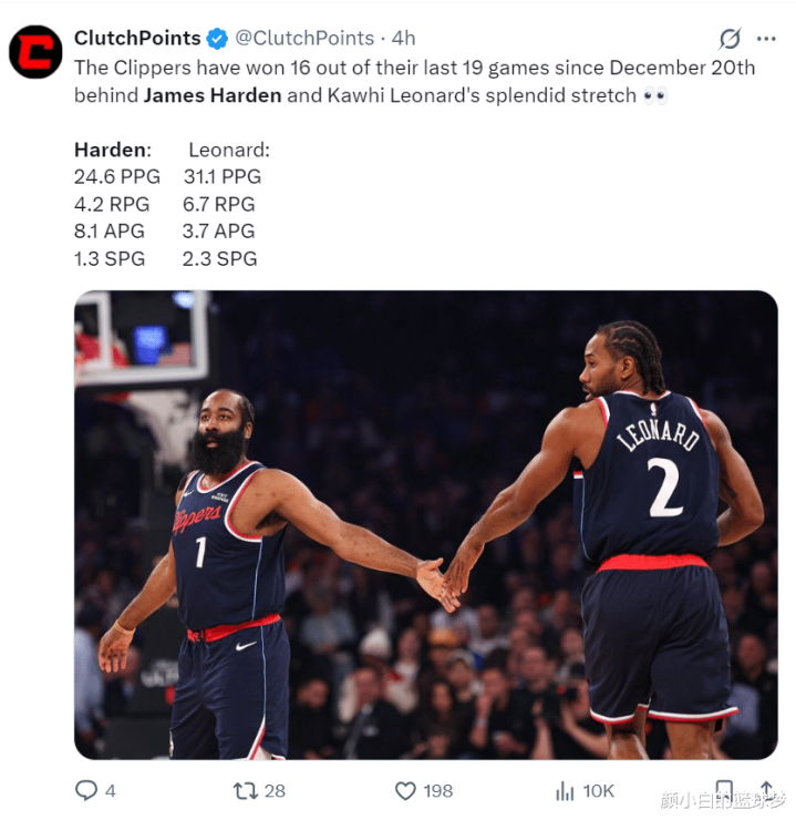 当然卡登依旧是这支快船的基本盘,哈登在这期间场均24.6分4.2篮板8.1助攻1.3抢断,小卡在这期间场均31.1分6.7篮板3.7助攻2.3抢断,在双巨驱动的情况下快船愈发强悍。很多人会说快船是吃了赛程红利,实际上呢?
