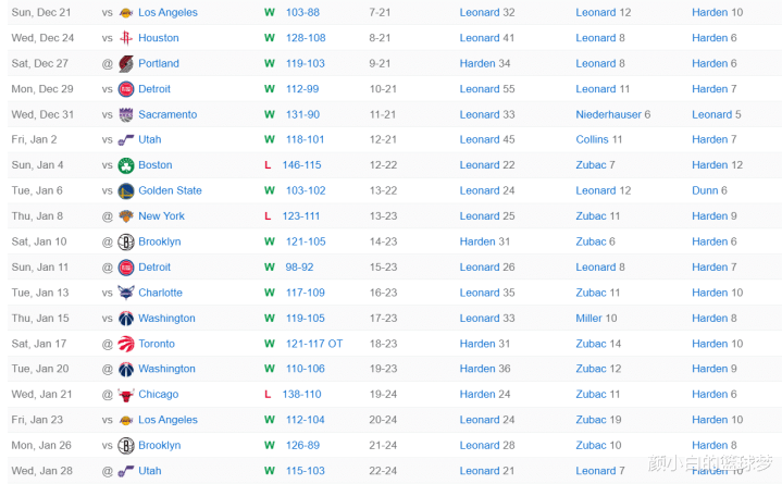 过去的19场比赛快船仅仅输给绿凯、尼克斯、公牛,期间快船击败了多支强队:湖人(2)、活塞(2)、猛龙、勇士、开拓者。