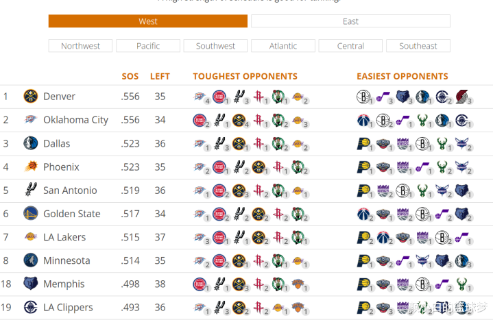 快船余下的36场比赛对手平均胜率仅为49.3%,排在西部倒数第六,换言之快船余下的赛程是西部第六轻松的,掘金余下的赛程最难,灰熊、勇士、独行侠、太阳作为快船冲击西部前六的竞争者余下的赛程都更难。